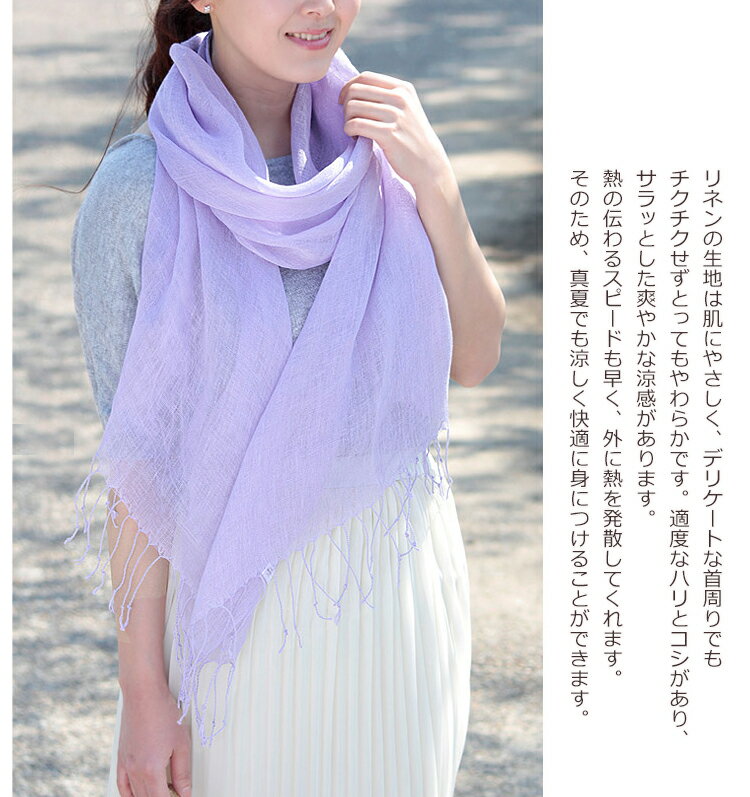 \今だけ特別割引/ 5%OFF!でこの価格! リネンの生地は肌にやさしくデリケートな首周りでもチクチクせずとってもやわらかです 適度なハリとコシがあり、サラッとした爽やかな涼感があります 熱の伝わるスピードも早く、外に熱を発散してくれます そのため、真夏でも涼しく快適に身につけることができます 透け感のある薄い生地でとても軽くなっています その軽さは身につけていることさえ忘れてしまうほどです 使っていくとナチュラルなシワ感が出てきます そして使えば使うほど肌にもより馴染み、やわらかくなっていきます 大判サイズのストールで首元に巻く以外に肩から羽織る使い方もでき、春夏の日除けや室内の冷房対策としても使いやすくなっています 使わないときは小さく折りたたみ、バッグに収納できます 持ち運びに便利で外出先でも邪魔になることはありません